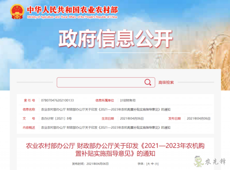 近日,農業農村部辦公廳、財政部辦公廳印發《2021—2023年農機購置補貼實施指導意見》。