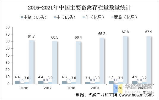 從下游養殖業來看,隨著近年來我國畜牧業的不斷發展,養殖規模的不斷擴大,使得我國飼料需求不斷增加,促進了我國工業飼料行業的發展。據資料顯示,2021年末我國生豬存欄4.49億頭,同比增長10.9%;牛存欄0.98億頭,同比增長2.7%;羊存欄3.2億只,同比增長4.3%;家禽存欄67.9億只,同比增長0.1%。