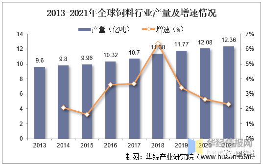 自從飼料工業化以來,全球飼料生產進入了新的階段,全球飼料產量不斷攀升。從全球飼料行業產量來看,整體上呈現逐年增長態勢。據統計,2021年全球飼料產量達到12.36億噸,同比增長2.3%,年均復合增速為3.2%。