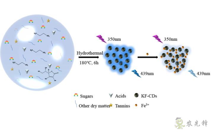該團隊首次采用獼猴桃作為合成熒光納米材料的生物質(zhì)碳源,通過實驗制備了一例具有Fe3+檢測能力的熒光納米材料——KF-CDs。科研人員使用手持式紫外分析儀發(fā)現(xiàn)添加Fe3+后該材料的熒光強度明顯變?nèi)酰移錈晒饨档偷内厔菖cFe3+的添加濃度在1-33.8微摩爾/升范圍內(nèi)呈線性分布。