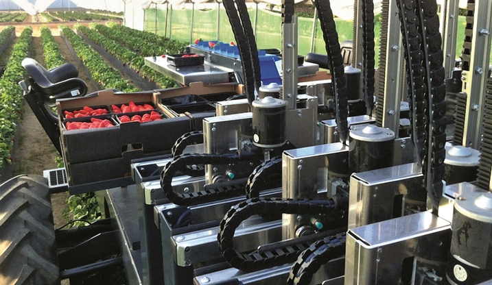 由于西班牙的南部是一個(gè)大型的生產(chǎn)草莓的農(nóng)場(chǎng),AGROBOT的工程師們就擺在他們面前的采摘問(wèn)題,設(shè)計(jì)出了解決方案,發(fā)明了這臺(tái)自動(dòng)化收割機(jī)AGROBOT。